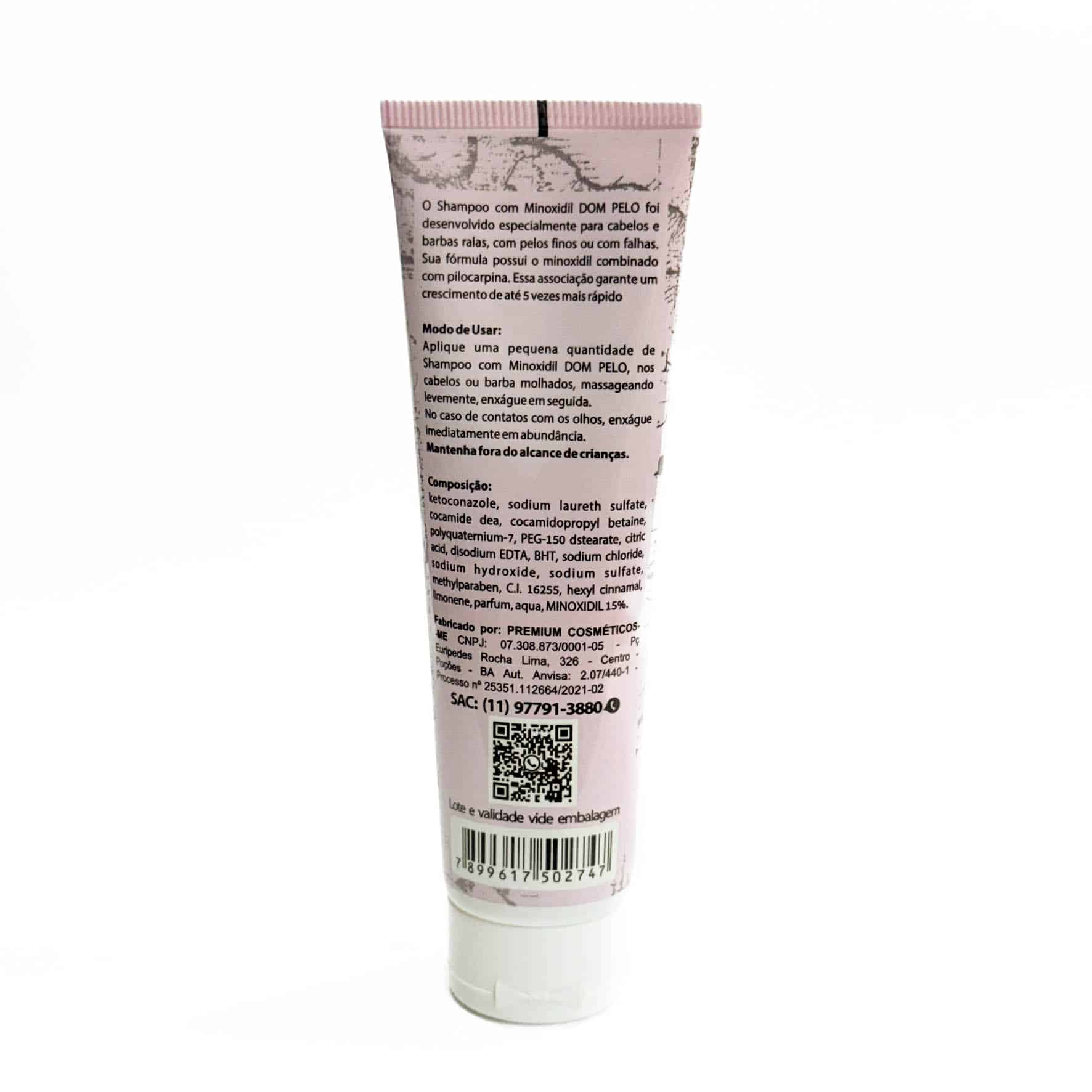 A fórmula  do shampoo com Minoxidil Dom Pelo  contém uma base balanceada proporciona o equilíbrio de tensoativos suaves gerando uma limpeza eficaz, evitando a agressão e ressecamento do couro cabeludo comum em produtos para tratamento deste mal.