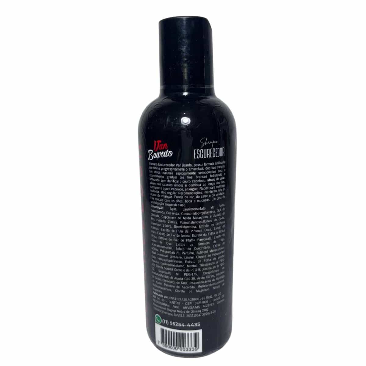 Shampoo Escurecedor Van Beards 250ml, elimina progressivamente o amarelo dos fios brancos, hidratando e fortificando sem danificar o couro cabeludo